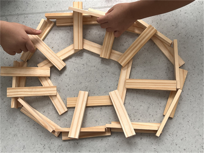欣欣:我们可以把积木拼在一起,变成厚厚的墙,那样就不容易倒啦!