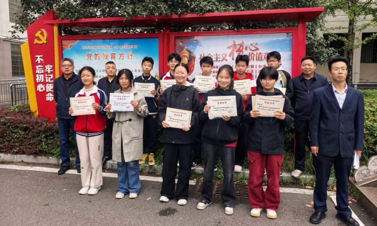 大会还对在多项县级赛事中获奖的师生进行表彰。在怀宁县教师、中小学生汉字书写大赛中,该校程兆军、曹小勇老师荣获中小学教师粉笔字比赛一等奖,905班毕梓童、904班何欣桐两同学分别荣获中学生汉字听写暨硬笔书写大赛二等奖、三等奖;在2025年怀宁县“强国复兴有我,争当新时代好少年”红领巾讲解员大赛中,807班凌欣雨同学荣获一等奖。四位校长再次为获奖师生颁奖,见证他们的荣耀时刻。