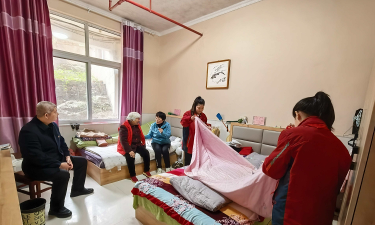 表演结束后,温情的志愿服务环节正式开启。党员代表率先行动,拿起抹布,仔细擦拭走廊的栏杆、活动室的桌椅,遇到窗户缝隙里的灰尘,便用小刷子一点点清理。少先队员们则分成小组,有的跟着工作人员走进老人房间,轻轻叠好床上的被子,将散落的衣物整齐叠放进衣柜,把桌上的水杯、药品按顺序摆放;有的则坐在老人身边,凑得近近地听老人讲过去的故事 —— 一位爷爷说起年轻时的工作经历,孩子们睁着好奇的眼睛认真倾听,时不时提问;还有同学主动为行动不便的奶奶捶背,力道轻柔适中,奶奶舒服地闭上眼睛,嘴角带着笑意;有的则拿起梳子,小心翼翼地为老人梳理头发,梳好后还轻轻整理鬓角,细致又贴心。