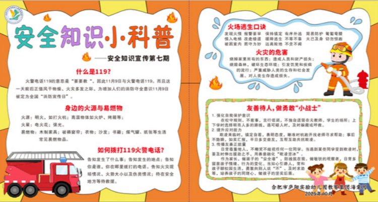 为进一步增强幼儿的消防安全意识,提高自我保护能力,合肥市庐阳实验幼儿园教育集团海棠园于十月开展了以“萌娃学消防 安全伴成长”为主题的消防安全教育活动,让消防安全知识浸润童心。