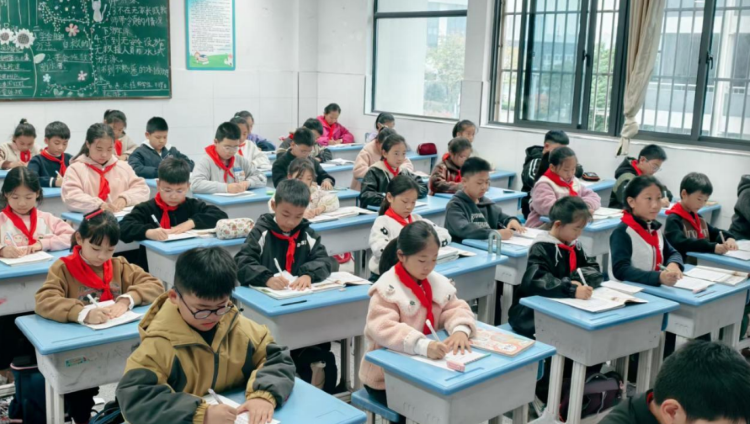 比赛按年级分组进行,二年级学生用铅笔书写,稚嫩笔 触中透着工整与规范;四年级学生则挥洒钢笔,字体或刚劲 有力,或婉转雅致,尽显书法韵律之美。比赛现场秩序井然, 学生们坐姿端正、握笔规范,神情专注,纸墨间流淌着对汉字文化的热爱与敬畏。