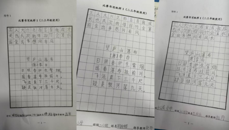 大赛精心设计书写内容,将书写训练与经典诵读、习惯 养成深度融合。二年级学生不仅专注书写基础汉字,夯实学 习根基,还以经典古诗为题材,书写古诗《望庐山瀑布》, 在诗意中提升书写流畅度;四年级书写课文《观潮》片段, 感受钱塘江大潮的雄伟壮观,实现“提笔即练字,练字即修心”的育人目标。