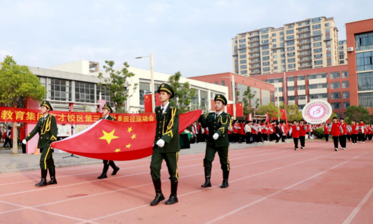 运动员队伍走过主席台尽显昂扬风姿,八年级、九年级运动员们,个个热血满腔、斗志激扬,誓在赛场书写辉煌。彩旗队旗帜飞扬猎猎如星河,映照出学子们的向阳逐梦之姿。升旗仪式上,五星红旗冉冉升起,全场目光紧随,激荡起赤诚的奋进豪情。