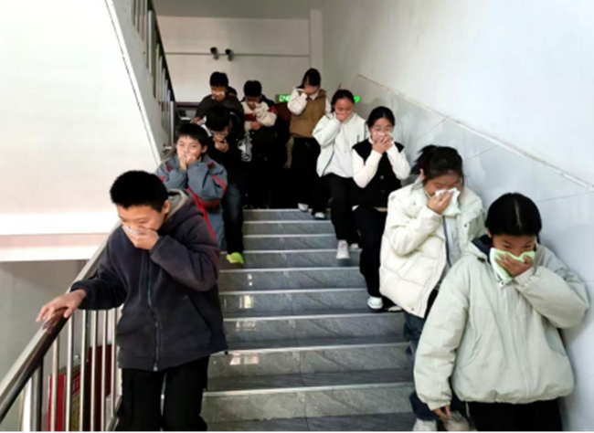 上午9:45,演练正式开始。政教处主任代东进通过广播再次强调安全要点后,模拟火灾警报信号发出,七年级各班学生在班主任的指挥下,迅速弯腰低头,用湿巾捂住口鼻,按照预设路线分前后门有序撤离教室。撤离过程中,学生们分成两排,紧靠墙面或楼梯扶手稳步前行,高楼层学生与低楼层学生相互礼让,无推挤、奔跑现象;各楼层值班教师坚守岗位,在楼道、楼梯口引导疏散,及时处置各类突发情况。