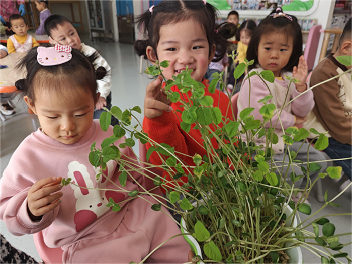 更珍贵的是情感的萌发。在日复一日的照料中,他们懂得了等待的意义,感受到了生命的奇妙与坚韧。当看到自己亲手照顾的豆子破土而出、茁壮成长时,那种责任感与成就感,化作眼中最闪亮的光。这棵小小的豆苗,不仅扎根在水里,更扎根在每个孩子的心田,“瞧!小二班是我们和豆子先生共同的家!”(刘燕敏)