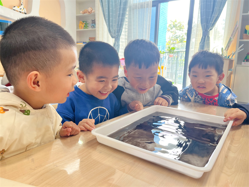 孩子们围绕“墨汁”展开了一场热闹的讨论。为了让他们更直观地体验、感受墨汁的变化,他们通过视觉、触觉、嗅觉初步认识了这位“新朋友”。