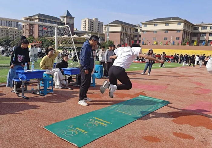 田赛场上同样异彩纷呈。立定跳远赛场,运动员腾空而起,如飞燕掠水,在空中划出优美弧线;跳绳赛场,彩绳翻飞似蝶舞,身影轻盈如云雀,绳影与人影交织成动人的韵律;实心球投掷区,运动员凝神聚力,奋力一掷,铅球划破长空,承载着梦想飞向远方。