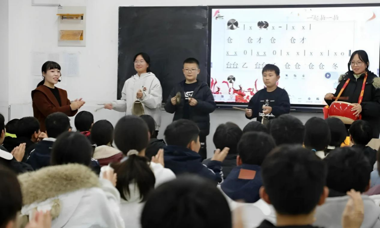 课堂伊始,王佳老师打破了传统课堂“教师讲、学生听”的单向开场逻辑,而是将民族打击乐器与学习导入深度结合。学生在主动参与中不仅快速进入学习状态,在潜移默化中建立节拍概念、培养协作意识,营造了积极的课堂氛围。