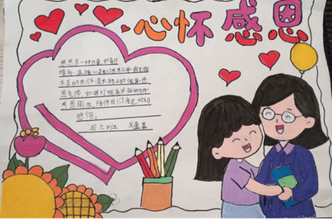 “感恩手抄报”创作中,大家以A3纸为载体分板块绘出心意,班级择优推选优秀作品。