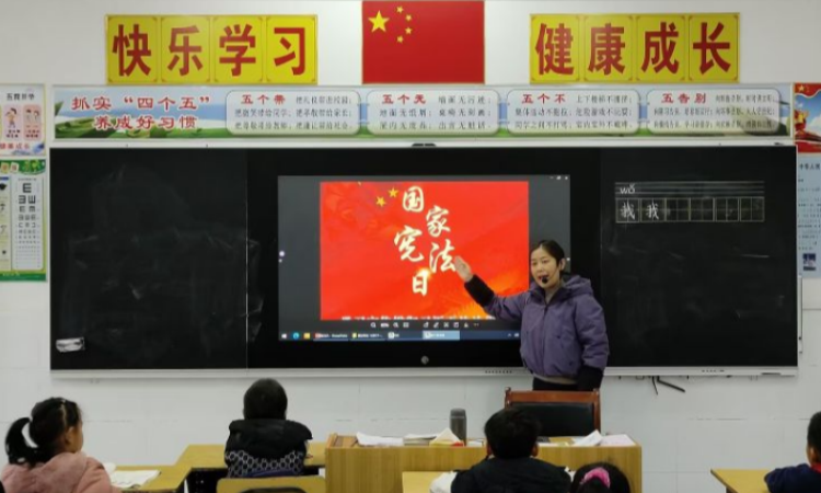 宪法主题班会上,各班班主任化身“法治导师”,围绕“宪法是什么”“宪法与我们的生活”等话题展开教学。低年级班级通过动画短片等形式,将抽象的法律条文转化为生动的故事,让孩子们明白宪法是保护大家的“护身符”;中高年级则结合校园欺凌、交通安全等案例,组织小组讨论“如何用法律保护自己”,同学们积极发言,分享自己对法治的理解。