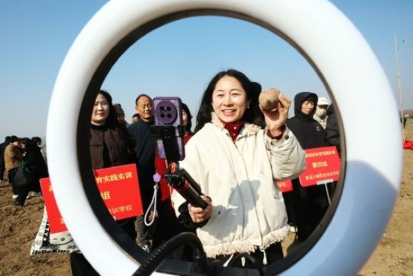 12月5日,蒙城县板桥镇的蜜薯田里一派热闹景象。由蒙城县农业农村局主办,濉溪少峰职业培训学校承办的2个高素质农民电商人才培训班共110余名学员,带着手机、三脚架走进田间地头,在沉甸甸的蜜薯藤蔓间开启了一堂别开生面的电商实操课。