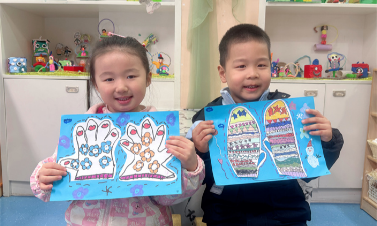 大一班的孩子们化身小小设计师,用画笔勾勒专属冬日手套!彩虹色的条纹、可爱的雪花图案、圆圆的小太阳,还有创意满满的几何图形,在画纸上尽情绽放。