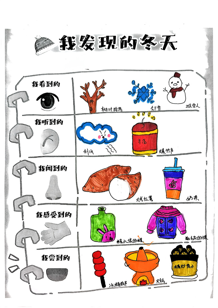 冬天是什么样子的呢?有什么变化?有哪些好吃的、好玩的、好看的呢?孩子们带着问题,和爸爸妈妈一起讨论,并用自己喜欢的方式记录下来。