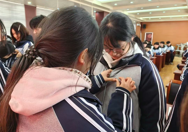老团员为新团员佩戴团徽。金色的团徽在胸前闪耀,象征共青团在党的光芒指引下团结前进。从这一刻起,他们正式成为共青团的一员,不仅多了一个身份,更肩负起一份沉甸甸的责任。