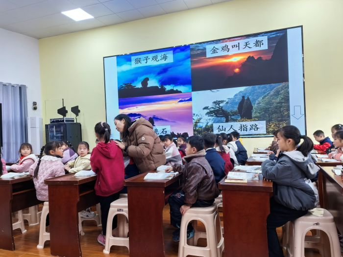 12月9日上午,薛九子老师执教语文《黄山奇石》,以“奇石探秘”为主线,通过播放黄山实景视频、展示奇石图片、引导学生讲解奇石等方式,将抽象文字转化为具象场景,充分激活学生想象力与表达欲,让学生在情境体验中感受语言文字的魅力,落实“语言建构与运用”核心素养;随后,吴彦芳老师带来《民间故事》的整本书阅读展示课,以学生为主体,从“梳理情节脉络”“分析人物形象”“品味文化内涵”三个维度搭建阅读支架,通过小组合作绘制故事思维导图、分享民间故事背后的民俗知识、经典故事创新表演等互动环节,教会学生深度品读民间故事的方法,培养学生的文化传承与理解能力。