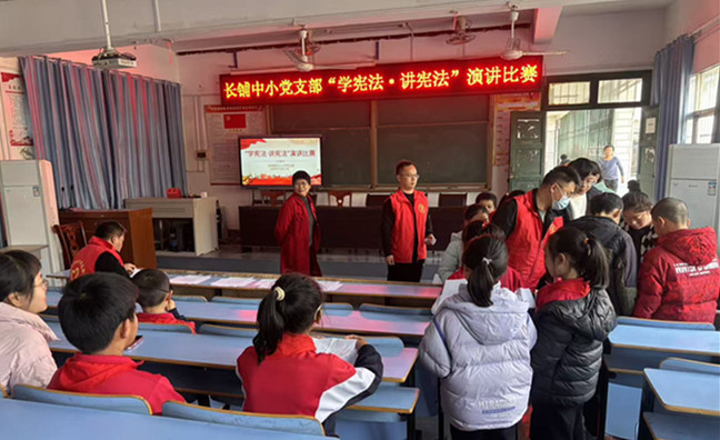 “宪法是什么?是保护我们成长的‘安全铠甲’,是规范生活的‘行为指南’!”近日,宿松县长铺中小的阶梯教室里掌声不断,一场别开生面的“学宪法,讲宪法”主题演讲比赛正在进行。与以往不同的是,赛场内外活跃着一群佩戴党徽的“红马甲”——这是学校党支部组织的党员志愿服务队,用贴心服务让法治种子在孩子们心中扎根。