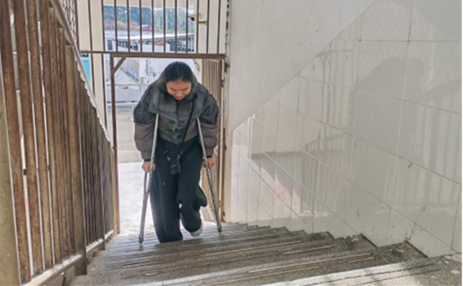 老师的一举一动孩子们看在眼里、记在心里。有人悄悄在讲台边放了一把椅子,方便她课间休息;上下楼梯时,总有三四个学生围在她身边,小心翼翼地扶着拐杖;下课交作业时,大家自觉排成整齐的队伍,连脚步声都放轻了许多,生怕耽误她哪怕一分钟。课间休息时,董赛君坐在椅子上,学生们围在她身旁,她用略带沙哑却依旧清晰的声音逐题讲解,阳光透过窗户洒在师生身上,与双拐的金属光泽交相辉映,构成了山区校园里最温情的画面。她多次尝试左脚着地,然而稍稍用力便是一阵锥心刺骨的痛感袭来,让她不得不放弃。