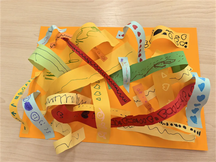 在用纸条创作中,小朋友发现用不同的纸剪出来的纸条软硬是不一样的,软硬不同的纸做出来作品也会不同。