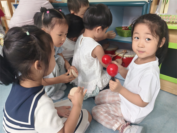 为了满足孩子们的好奇心,我在音乐表演区投放了各种各样的打击乐器。
