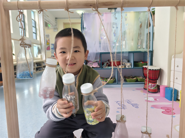 在家长的配合下,我们发起了一场“家庭寻音大发现”活动。孩子们和爸爸妈妈一起,当起了家中的“音乐侦探”。孩子们伸出好奇的小手,轻轻地、有节奏地敲击::用勺子轻敲炒锅的底部,“咚——”,发出沉稳浑厚的声音,像一位低音歌手;锅和铲子“哐哐”地合奏,就像在表演一段热烈的对话。有了发现,便有了创造的冲动。孩子们迁移经验,开始在区域活动中动手制作属于自己的打击乐器。铁锅和奶粉罐变成威风的大鼓,酸奶瓶和豆子组合成沙锤,瓶盖串在一起成了串铃……创意无限,乐趣无穷。