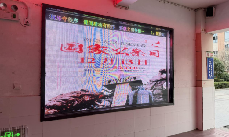 红领巾广播站同步推出“铭记历史共筑和平”主题特别节目,通过红领巾宣讲员的深情讲述与心声传递,让爱国主义精神在校园中广泛传播;校园电子屏滚动播放公祭日相关图片与视频,营造出庄重肃穆的宣传氛围,引导师生在驻足观看中深刻思考历史意义,自觉践行和平理念。