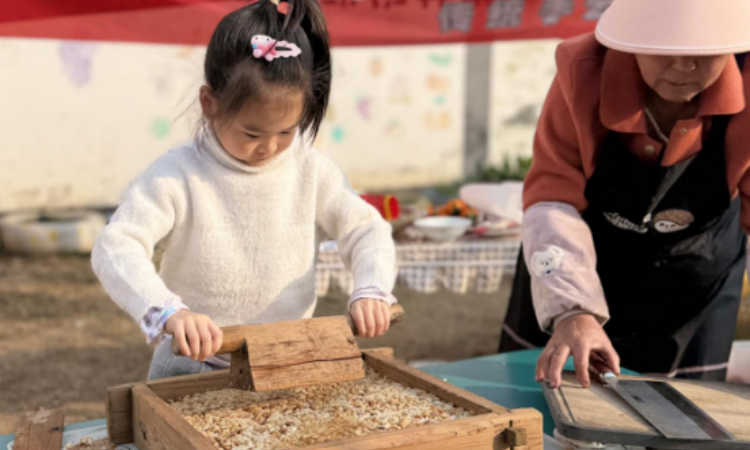 活动中,小班组的孩子们聚焦黄豆粉制作,在手艺人的指导下学习筛选黄豆、观察炒及研磨过程,感受粉末簌簌落下的奇妙;中班组的“手打年糕”热闹非凡,孩子们轮流上阵,在教师和手艺人的保护下体验捶打糯米团的乐趣,看着软糯的年糕在反复捶打下逐渐成型,脸上洋溢着成就感;大班组的孩子们则专注于制作花生糖,从剥花生、炒糖色到搅拌塑形,每一个步骤都认真参与,孩子们在动手实践中感知食材的变化,在味蕾体验中探寻年味的真谛。整个户外场地香气四溢,孩子的欢声笑语与手艺人的指导声交织在一起,构成了一幅温馨的民俗画卷。