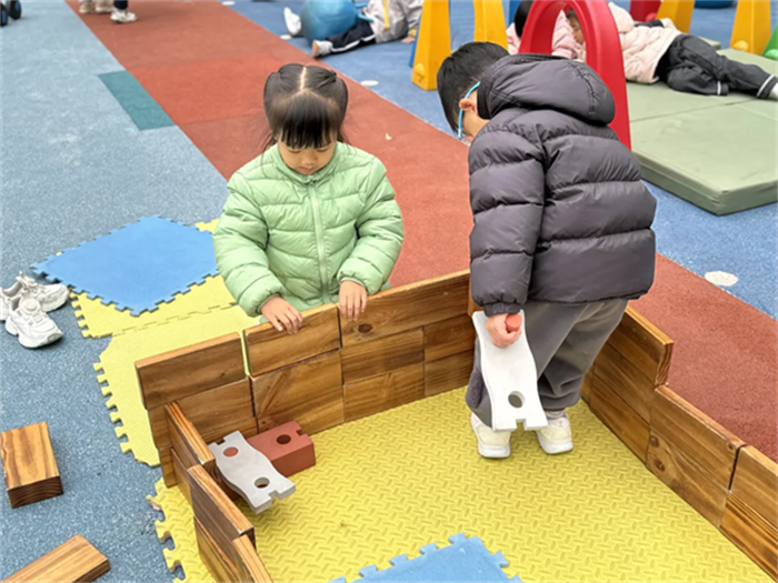 在后面的游戏中,幼儿互相合作,搭出来的“家”有了不同的区域划分,比如客厅、卧室、厨房、餐厅等,有的还设置滑滑梯等游乐区域。与此同时,孩子们的游戏也在不断发生新的变化……