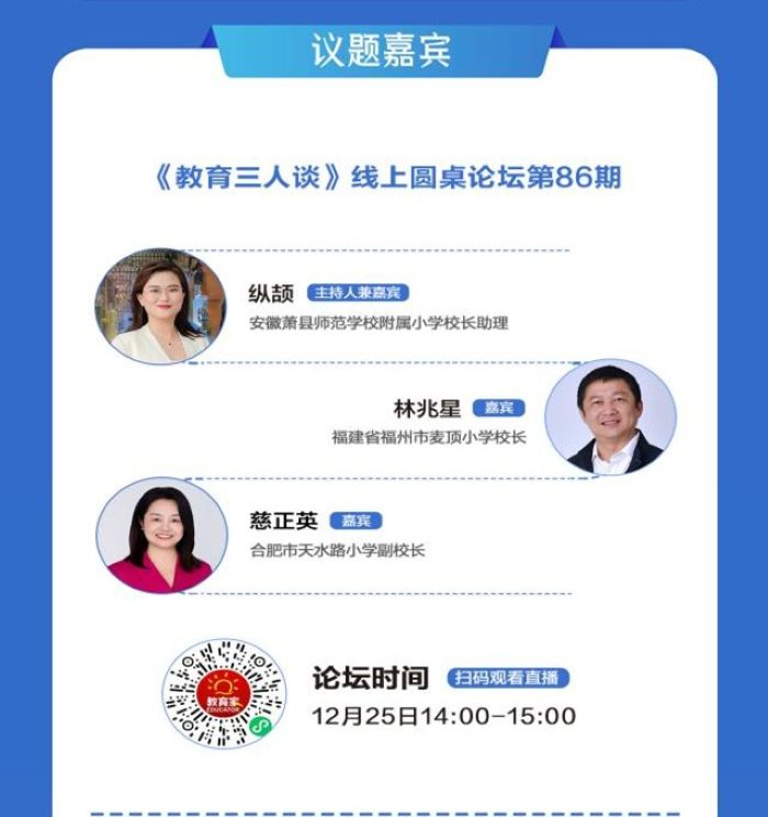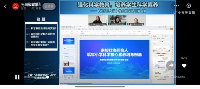 12月25日,宿州市纵颉优秀少先队辅导员工作室领衔人、萧县师范学校附属小学校长助理纵颉应邀参加光明日报《教育家》杂志《教育三人谈》线上圆桌论坛,围绕“强化科学教育,培养学生科学素养”主题,开展“家校社协同提升学生科学核心素养”专题分享。