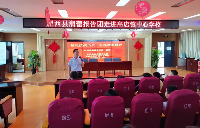 在九.一八”事变纪念日之际,9月17日下午,安徽省肥西县“润蕾”报告团走进高店镇中心学校,讲师黄璜为该校100多名师生开展了“铭记抗战历史,弘扬铁血精神”主题宣讲。