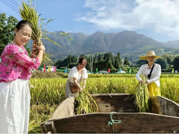活动中,农事体验项目也同步进行。镰刀轻挥,稻谷飘香,传统的打稻声此起彼伏。