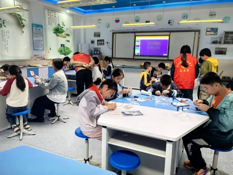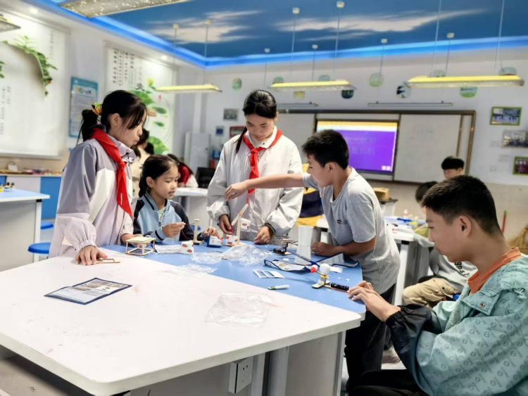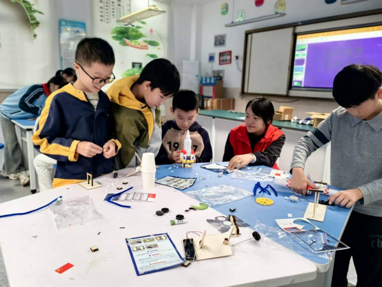 随后,活动进入动手实践环节。在学校的创新实验室内,同学们在志愿者和老师的指导下,分组进行航天模型拼装。空间站、神舟火箭、火星车、载人飞船等模型材料迅速激发了同学们的制作热情。大家认真研究图纸、细心组合零件,相互协作,顺利完成拼装。当亲手组装的火箭模型挺拔竖立、空间站缓缓转动、火星车行走时,实验室里响起了阵阵成功的欢呼声,现场气氛热烈,俨然在他们心中播下了航天梦想的种子。