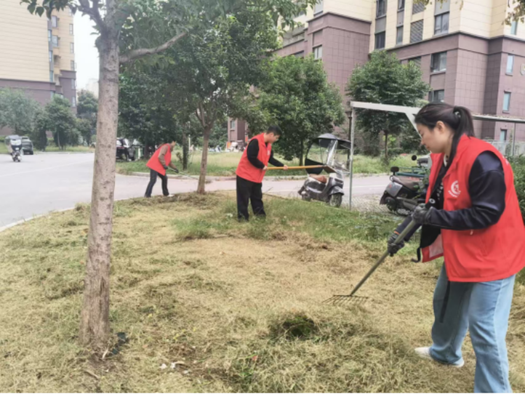 行动前,社区两委提前通过居民群、公告栏发布通知,明确修整范围与时间,同时收集居民对草坪养护的建议,确保工作贴合大家需求。两委成员与社工们分工协作:有的手持割草机修剪过高的草株,有的弯腰用耙子除杂草、清理枯枝落叶,有的手持剪刀修剪草垛形状,大家不怕脏、不怕累,忙碌的身影成为小区里一道温暖的风景线。不少居民看到后,也主动加入进来,有的帮忙修剪草垛,有的协助清运垃圾,现场形成了“社区主导、社工发力、居民参与”的良好氛围。