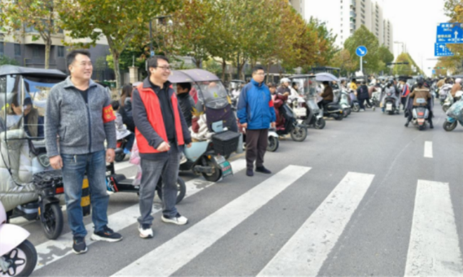 活动中,社区工作人员和志愿者在学校门口及周边路口,引导学生安全过马路、有序进出校园。同时,温馨提示过往行人骑车时佩戴头盔,不超载;引领、劝导接送孩子的家长在十字路口有序通行,不聚集、不闲谈,并提醒过往车辆和家长遵守交通规则,注意避让学生,引导学生在安全区域内行走。