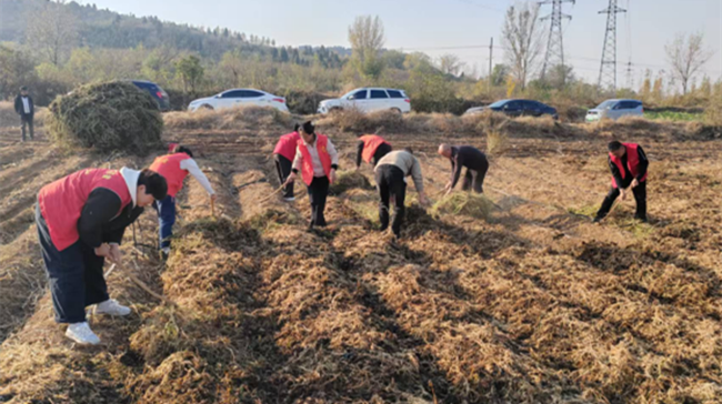 从田间画面可见,志愿者们身着橙红色志愿马甲,手持镰刀、锄头,或蹲身拔秧,或挥锄清理残茎,将成捆的红薯秧归拢堆放。有的志愿者裤脚沾了泥点,仍动作麻利地将藤蔓与土壤分离;有的两两配合,一人割秧、一人捆扎,不一会儿便在垄间堆起整齐的秧垛。暖阳下,田埂旁的电线、远处的民居与劳作的身影相映,勾勒出党群共助农忙的生动图景。