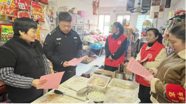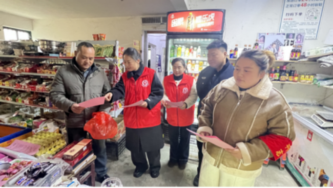 活动中,宣传小组沿着辖区主干道有序推进宣传工作:走进便利店、副食店等经营场所,向商户逐一发放《致全县广大群众的一封信》,结合政策条文解读禁放时段、管控区域及违规处罚标准,提醒商户不得违规销售烟花爆竹,并引导其向消费者同步宣传禁放要求;随后前往社区休闲广场,面对面向居民讲解燃放烟花爆竹带来的噪音污染、火灾隐患等危害,用通俗易懂的语言普及“不放烟花爆竹、共护清新环境”的理念。