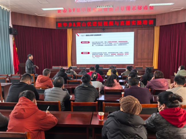 近日,黄山区新华乡联合黄山优诺互联网科技有限公司,为村“两委”干部、本土企业代表及农村创业青年量身定制短视频与直播培训,用数字技术为乡村振兴插上“翅膀”。培训不走“填鸭式”流程,而是以“沉浸式体验+实战化教学”破题。第一阶段,学员们走进黄山优诺互联网科技有限公司的直播基地,近距离观摩主播选品、话术互动、流量运营全流程,直观感受电商直播的“台前幕后”;第二阶段,企业专业讲师围绕“短视频怎么拍才吸睛”“直播流量从哪来”等核心问题,结合新华乡农产品特点,手把手教学脚本设计、运镜构图、粉丝维护等技能,还通过模拟带货场景,让学员们当场上手实操,遇到问题随时答疑。