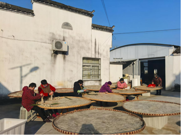 寒冬时节,黄山区乌石镇夏村村的黄山土未中草药专业合作社门前,晒满了晶莹透亮的红薯粉丝,几位阿姨一边利落地捆扎粉丝,一边拉着家常。