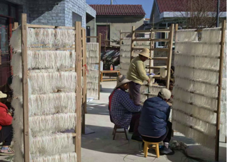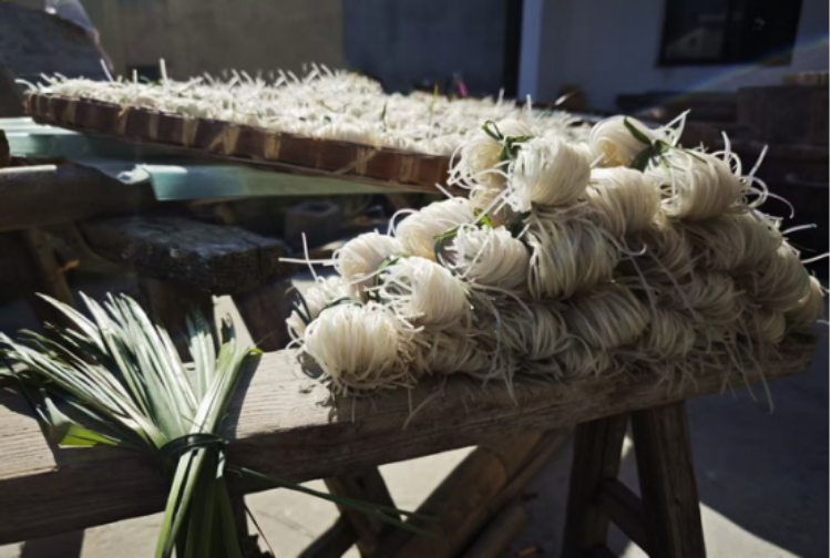 据悉,岭上村的红薯粉丝制作加工已有几十年的历史,村民们沿袭传统手工技艺,从新鲜红薯的清洗、粉碎、过滤、沉淀,到淀粉的蒸制、晾晒,每一道工序都凝结着代代相传的智慧与经验。岭上村海拔高,红薯生产周期长,得益于独特的自然环境,这里出产的红薯品质优良,为制作优质粉丝提供了上好原料。经传统手工工艺制作而成的红薯粉丝,纯净、透明、色泽晶莹、耐煮不糊、口感劲道,颇受消费者青睐。