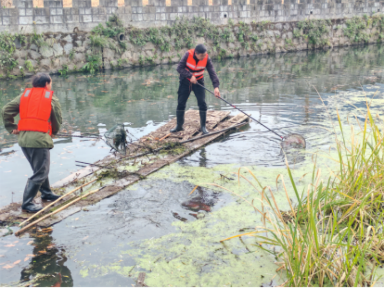 行动中,乡、村两级干部下沉一线、现场指挥,党员及志愿者积极参与,共同投入河道清理工作。丰溪河上,新丰村党总支书记汪建胜身穿救生衣,立于竹筏之上,带头打捞水面漂浮物与枯枝杂草,示范水上作业,全程严格执行安全操作规程,采取分段作业方式,并全程配备救生装备,确保整治工作安全有序推进。“环境整治不仅要见实效,更要守牢安全底线。”汪建胜在现场表示。