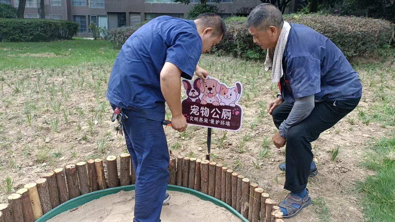群众的呼声就是工作的号角。社区迅速联合小区物业制定 “宠物友好计划”:在宠物活动频繁的6号楼后方花园、8号楼小广场等区域,统一安装露天便于发现和清理的宠物便便池;物业还专门培训保洁人员,在近期整治宠物粪便行动中每日早晚两次对便便池进行清运消毒,形成“投放—收集—处理”的闭环管理。