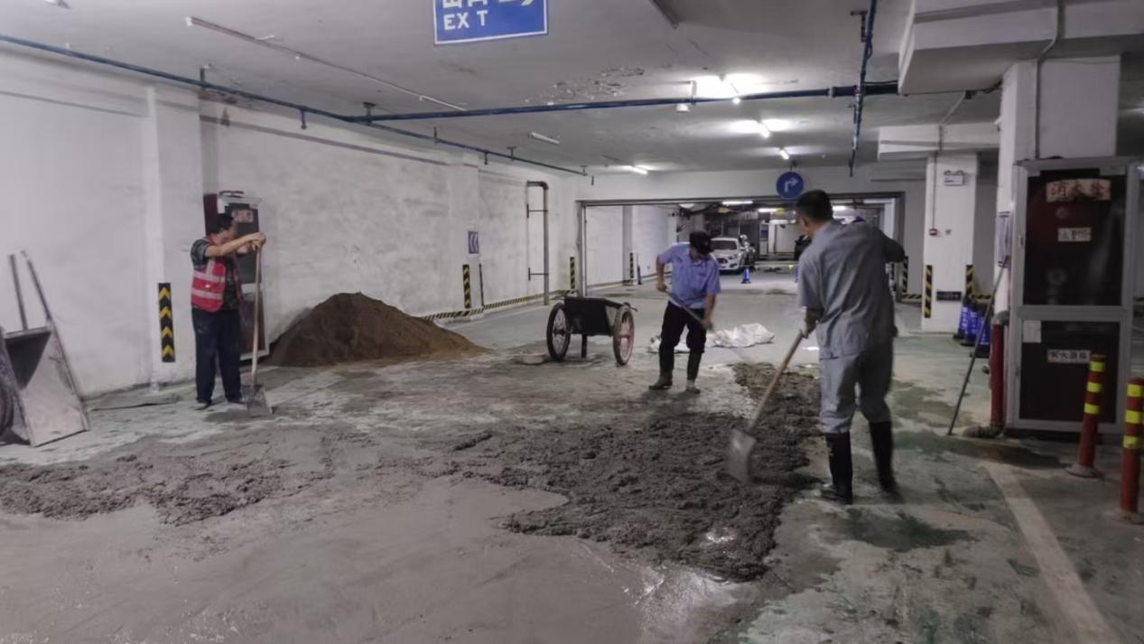 排查工作结束后,社区立即组织物业维修团队制定修复方案,明确修复流程、材料选用及时间节点。为减少施工对居民出行的影响,维修工作选择在周末及工作日非高峰时段进行,并提前通过小区公告、微信群等方式告知居民施工范围及注意事项,引导居民绕行施工区域。经过一段时间的紧张施工,目前寿春华府小区地下车库的主要通行破损地面已全部修复完毕,部分破损地块正在有序修复中。