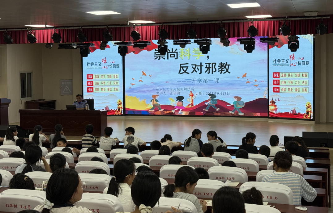 为切实增强青少年反邪教免疫力与法治意识,帮助学生系好 “法治人生第一粒扣子”,9 月17日,六安裕安区城南司法所联合辖区凤凰河学校,面向该校初一年级 400 余名学生开展 “反邪 + 民法典” 主题开学第一课活动,通过案例讲解、互动问答、礼品激励等形式,为青少年送上一堂生动的法治教育课。