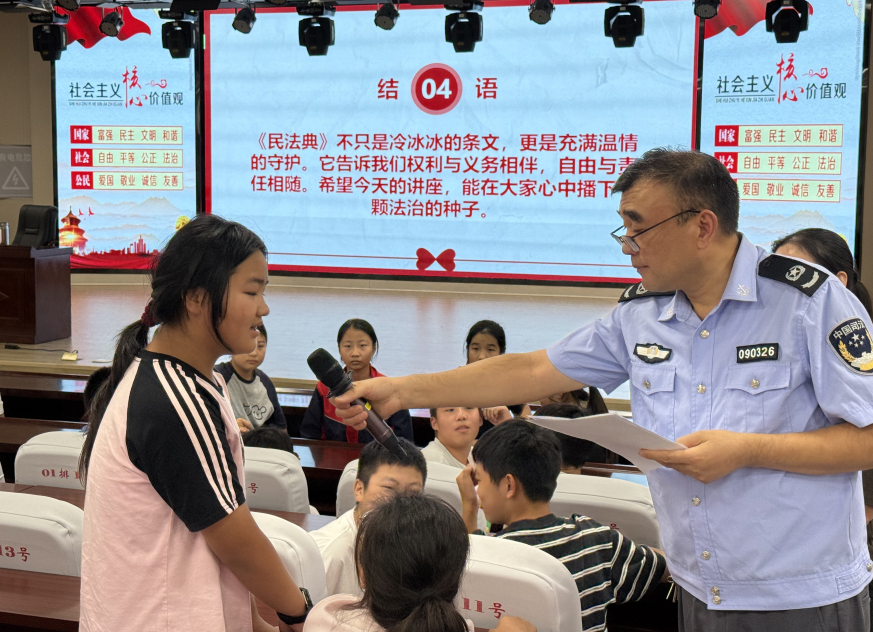 “邪教常利用哪些名义欺骗青少年?”“未成年人遭受网络侵权,应该怎么做?” 在互动问答环节,张所长设计了 “反邪知识闯关” 与 “民法典校园情景题” 两大模块,题目紧贴课堂讲解内容,兼具知识性与趣味性。学生们积极举手抢答,现场氛围热烈。为鼓励参与,工作人员为抢答正确的同学送上精心准备的法治纪念礼品。