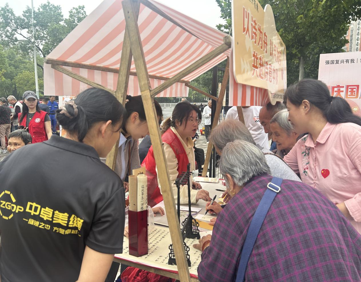 此次活动以文化体验与趣味互动为核心,打造多元参与场景。在“以诗为舟,以月为引”展台前,居民提笔手写含“月”字诗词,在笔墨间感受中秋的诗意浪漫;“与‘国’同框”打卡点人气高涨,居民手持定制手举牌拍照留念,领取趣味贴纸、小国旗、头饰发夹等节日小物,感受浓浓的节日氛围。