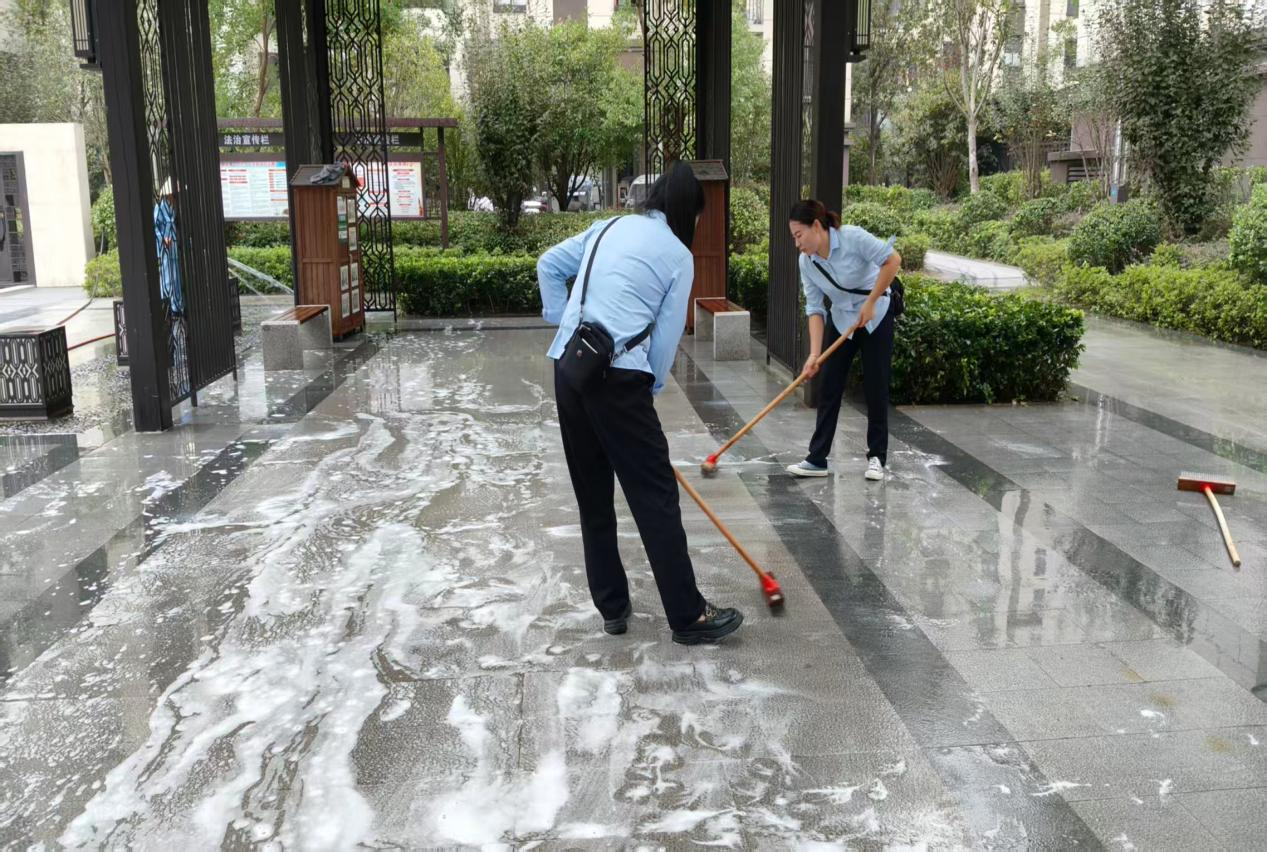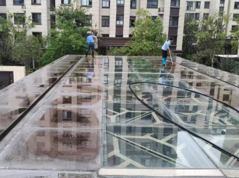 行动中,物业服务企业积极响应、主动作为,组建由保洁人员、维修师傅组成的专项清洁队伍,提前准备好高压清洗机、玻璃清洁剂、抹布、扫帚等工具。在玻璃雨棚清洗现场,工作人员先仔细铲除雨棚表面附着的顽固污渍,再用高压清洗机对雨棚进行全面冲洗,确保每一处角落都干净透亮;门厅路面清洁过程中,大家分工协作,不放过任何卫生死角。清洗工作得到了不少居民的点赞支持,有居民主动拿出家中清洁工具帮忙,还有老人带着孩子在一旁驻足,感慨道:“社区和物业真是把实事办到了咱们心坎上,看着干干净净的雨棚和路面,心里都亮堂多了!”