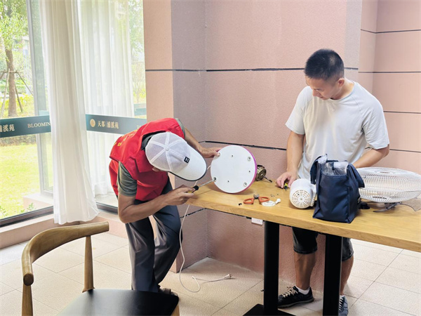现场吸引了众多居民前来参与。免费维修区域,郑伯伯带领家电维修能人们专注地为居民们检修台灯、电风扇等家用电器。“家里这些老家具用了很多年,用不了又不舍得扔,没想到志愿者一下就修好了,太方便了!”王阿姨高兴地说。志愿者们耐心细致,不仅修复了故障设备,还向居民讲解了日常保养小技巧,让大家收获满满。