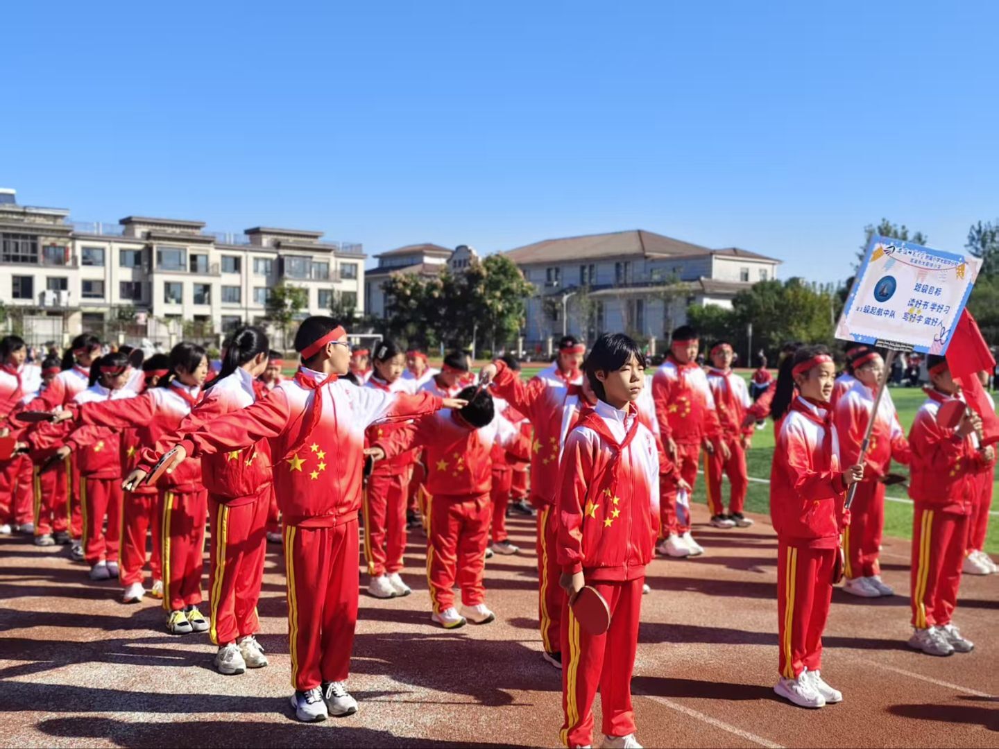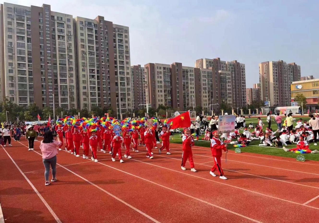 家长和志愿者方阵喊着“邻里互助 健康同行”的标语牌,步伐整齐有力,尽显社区担当;学校各年级方阵创意十足,有的手持彩色气球组成“阳光少年”字样,有的以跳绳、呼啦圈等运动道具穿插展示,还喊出“活力校园 勇创佳绩”的响亮口号,童真与活力扑面而来。最后,社区代表与学校校长共同组成的领队方阵压轴登场,标志着校社携手共促健康成长的决心,现场掌声与欢呼声不断。此次方阵展示不仅拉开了运动会的序幕,更让社区与学校的凝聚力在整齐的步伐中进一步增强,为后续的运动项目营造了热烈氛围。