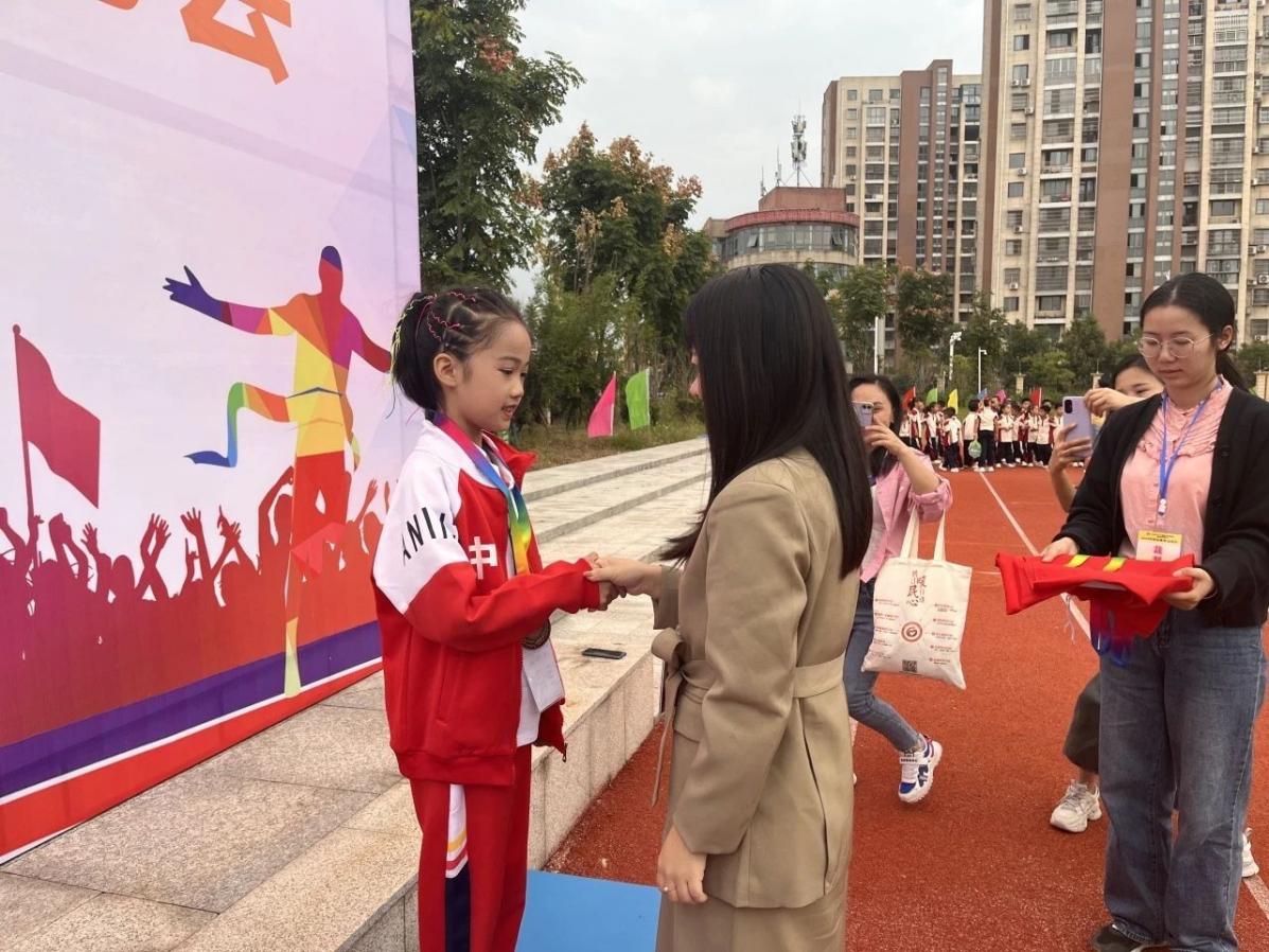 趣味运动 校社联动。运动会设置了多项兼顾趣味性与竞技性的项目。竞技类涵盖短跑、跳绳、跳远、铅球等传统项目,学生们全力冲刺、奋勇跳跃,展现出强劲的运动实力;趣味类则推出“两人三足”“接力运球”“拔河比赛”等团体项目,同学们相互协作、呐喊助威,操场上笑声与加油声此起彼伏。社区志愿者全程协助维持秩序、记录成绩,并为获奖学生颁发了运动水杯、跳绳等实用奖品,鼓励大家坚持体育锻炼。