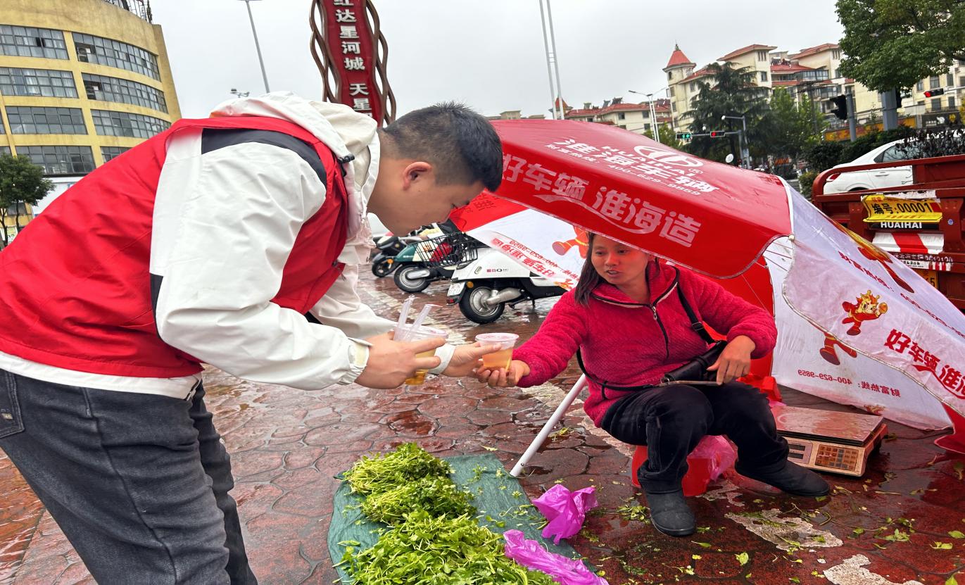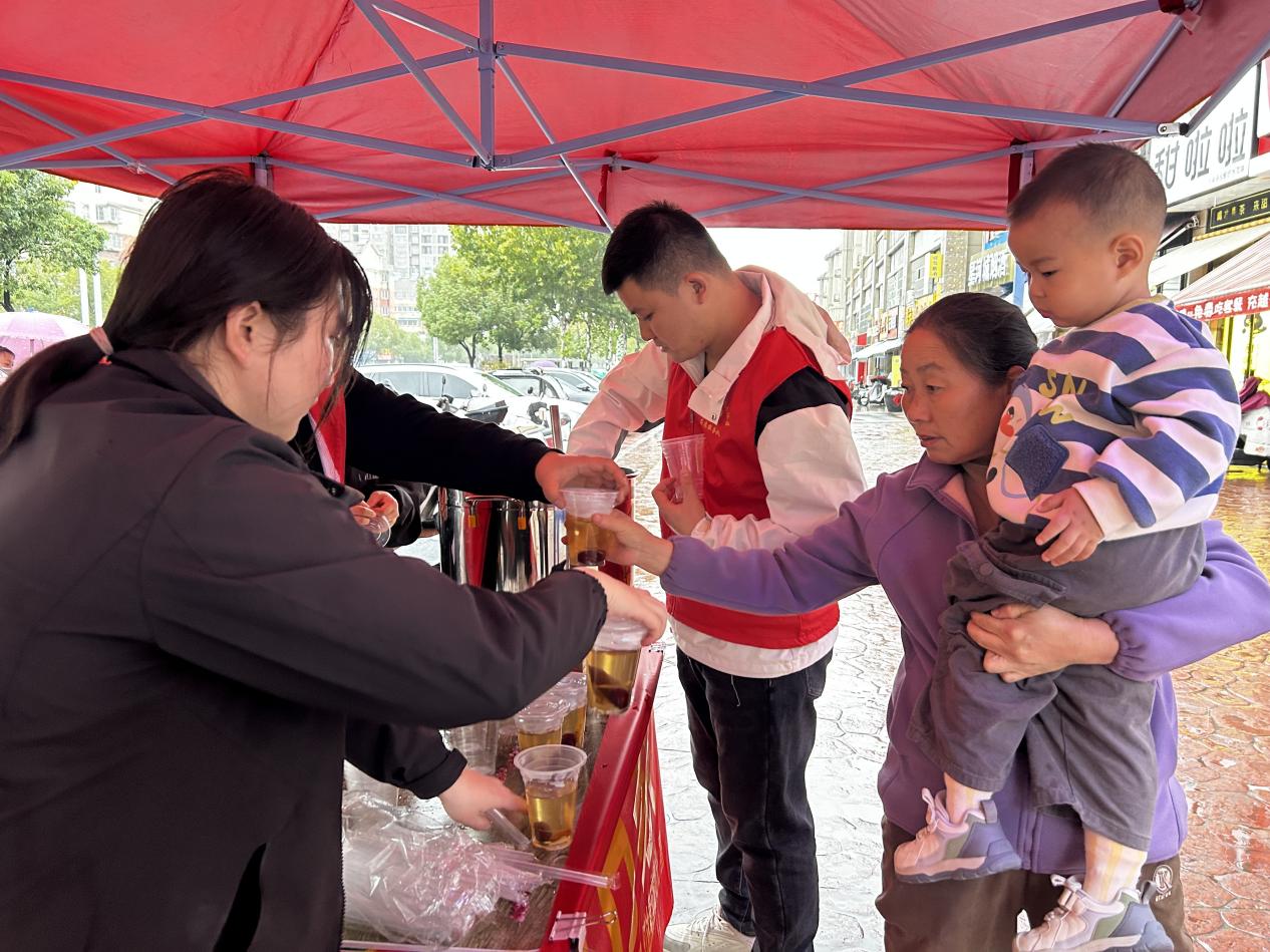 旁边菜市场正在卖菜的阿姨,正冻得打哆嗦,这杯姜茶真是太及时了!”王阿姨接过志愿者递来的姜茶,双手捧着纸杯感受着暖意,喝了一口后连连称赞。据了解,活动中志愿者们格外关注老年群体和儿童,看到拄拐杖的老人或带孩子的家长,都会主动上前递上姜茶,并提醒他们雨天路滑、注意保暖。