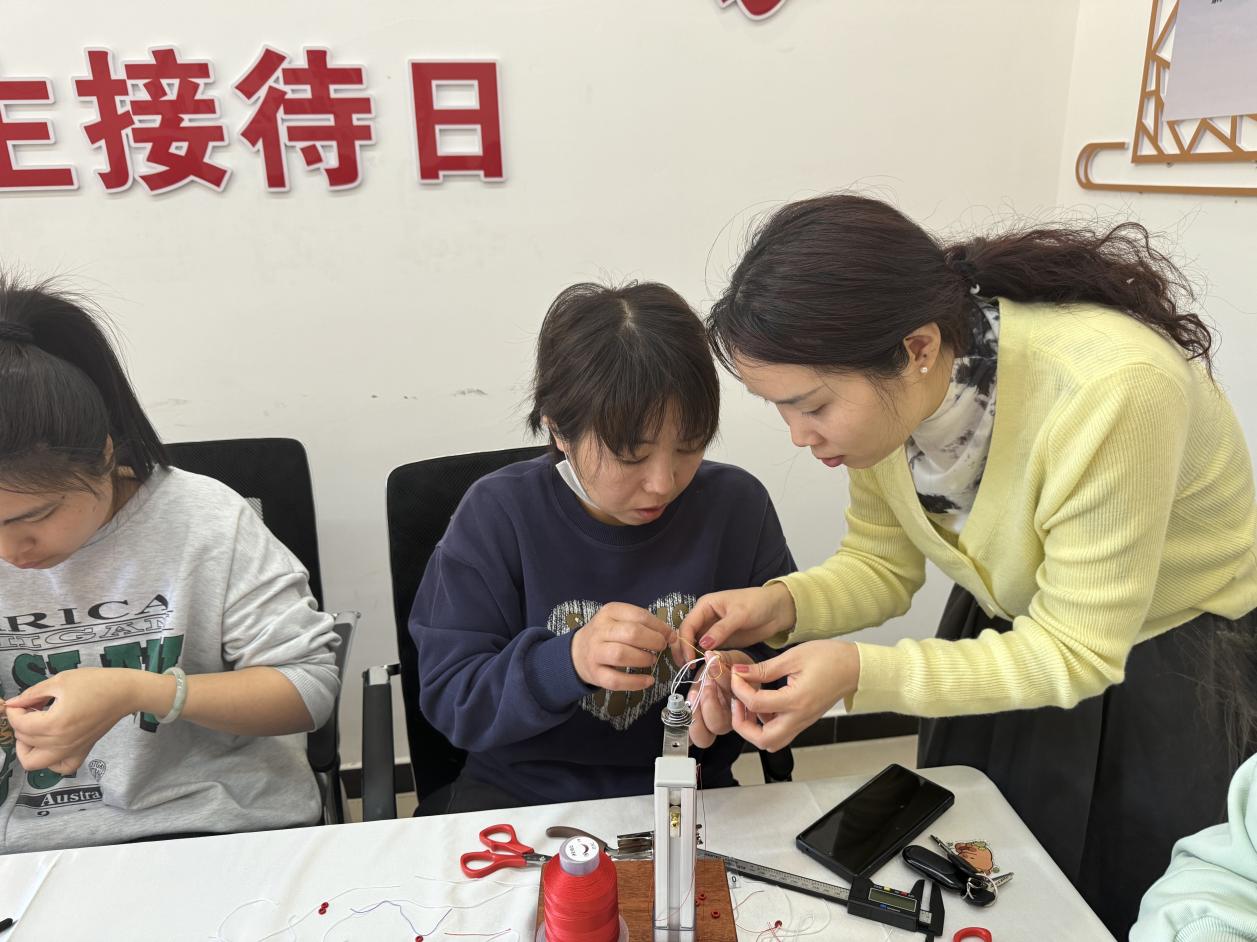 驿站培训现场,王老师从基础的编织手法讲起,耐心细致地为学员们示范起线、编织、打结等操作技巧,并针对不同学员的掌握情况进行一对一指导。学员们围坐在一起,认真听讲、仔细观察,积极动手实践,遇到不懂的地方及时向老师请教。已经工作一月有余的赵英艳女士一边娴熟地加工产品,一边开心地念叨:“家里老人年纪大了,还有小孩需要照顾,不能出去务工,家门口的‘小手工’让我既能照顾家庭、照顾老人,每个月还能通过做手工赚些零花钱。”